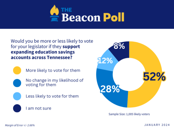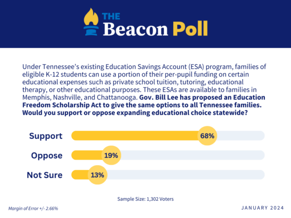 One of the biggest issues in the state legislature this year will be the debate over a statewide educational choice proposal by Governor Bill Lee. According to the Beacon Poll, it appears a large majority of Tennesseans are with the Governor when it comes to making Educational Savings Accounts (ESAs) available to students statewide. A whopping 68% of Tennessee residents support Governor Lee’s proposal, while just 19% oppose his plan. The plan is supported by an overwhelming majority of Republicans (85%), as well as a majority of Independents (56%) and Democrats (56%).