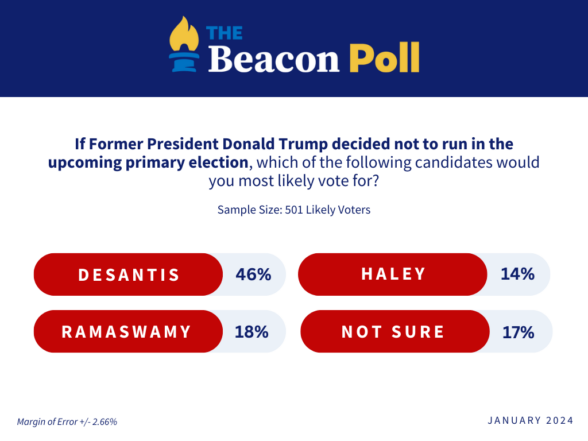 There has been a lot of discussion in the national press about what would happen if Donald Trump and/or Joe Biden decided not to run for president. The Beacon Poll shows that a strong plurality of likely Republican voters (46%) prefer Florida Governor Ron Desantis if Trump were not to run. Vivek Ramaswamy would take second place at 18% and Nikki Haley is in third with 14% of the vote.
